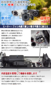 日本国内で防犯カメラを設置する場合、著しく暑い、寒い環境の場合はカメラに不具合を きたす可能性があるため、それ専用のものを設置することおすすめします。 寒冷地・温暖地用に温度センサーが搭載されており、温度に応じてヒーターやファンが作動しカメラ本体の温度を 適正な温度に保ってくれます。